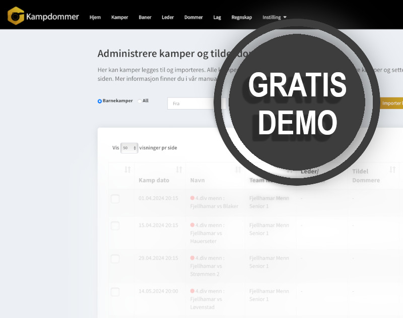 Kampdommer importerer automatisk din klubbs kamper fra NFF. Du kan selvsagt legge inn egne kamper.